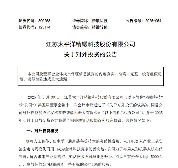6月3日,精锻科技(300258)公告,拟以自有资金5000万元参与武汉格蓝若智能机器人公司A轮融资,持有其10%的股权。此次投资旨在布局人形机器人核心供应链,抢占未来产业制高点,实现技术协同与业务升级。