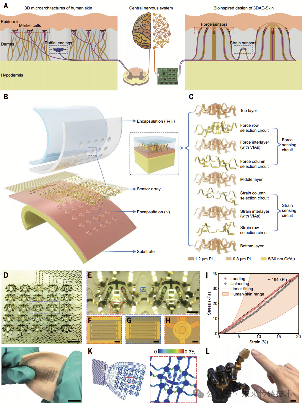 2024年8月清华大学张一慧教授课题组通过受生物启发的3D结构设计、异质封装策略和微加工技术,开发了一种模仿人体皮肤中机械感受器三维分布的3DAE-Skin,这种仿生设计利用了力和应变传感组件的3D分布及电子皮肤中的工程刚度变化,实现了压力、剪切力和拉伸应变的解耦感知,可广泛应用于其他类型的假肢和机器人系统。