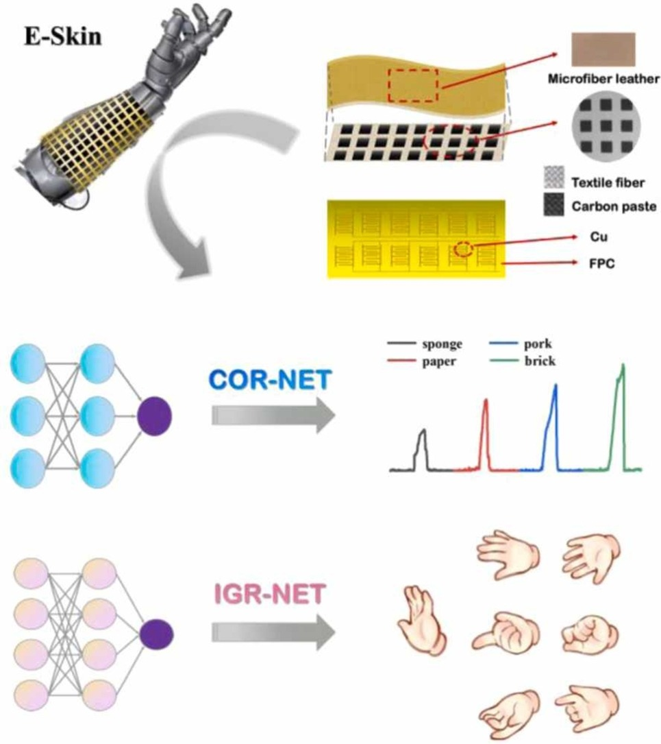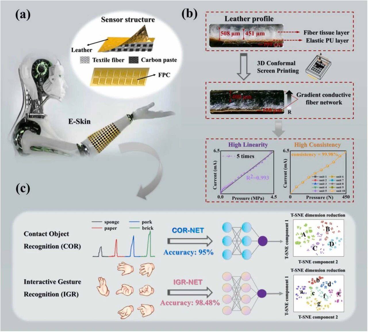 在技术创新与应用突破方面,中国科学院重庆绿色智能技术研究院的科研团队取得了显著进展,他们开发的新型皮革基微结构表面丝网印刷技术,成功制备出具有垂直梯度导电纤维网络的阵列式电子皮肤。这种独特的多层分级结构赋予电子皮肤卓越的性能:在 0-4.5 MPa 的超宽压力范围内保持 99.30% 的高线性度和 99.98% 的高一致性,响应与恢复时间均小于 10 ms,且经过 7500 次循环测试后仍保持优良稳定性,对人手交互意图的判断准确率更是高达 98.48%,可支持机器人完成精准抓取、碰撞预警等复杂操作,大幅提升人机交互的安全性与自然性。