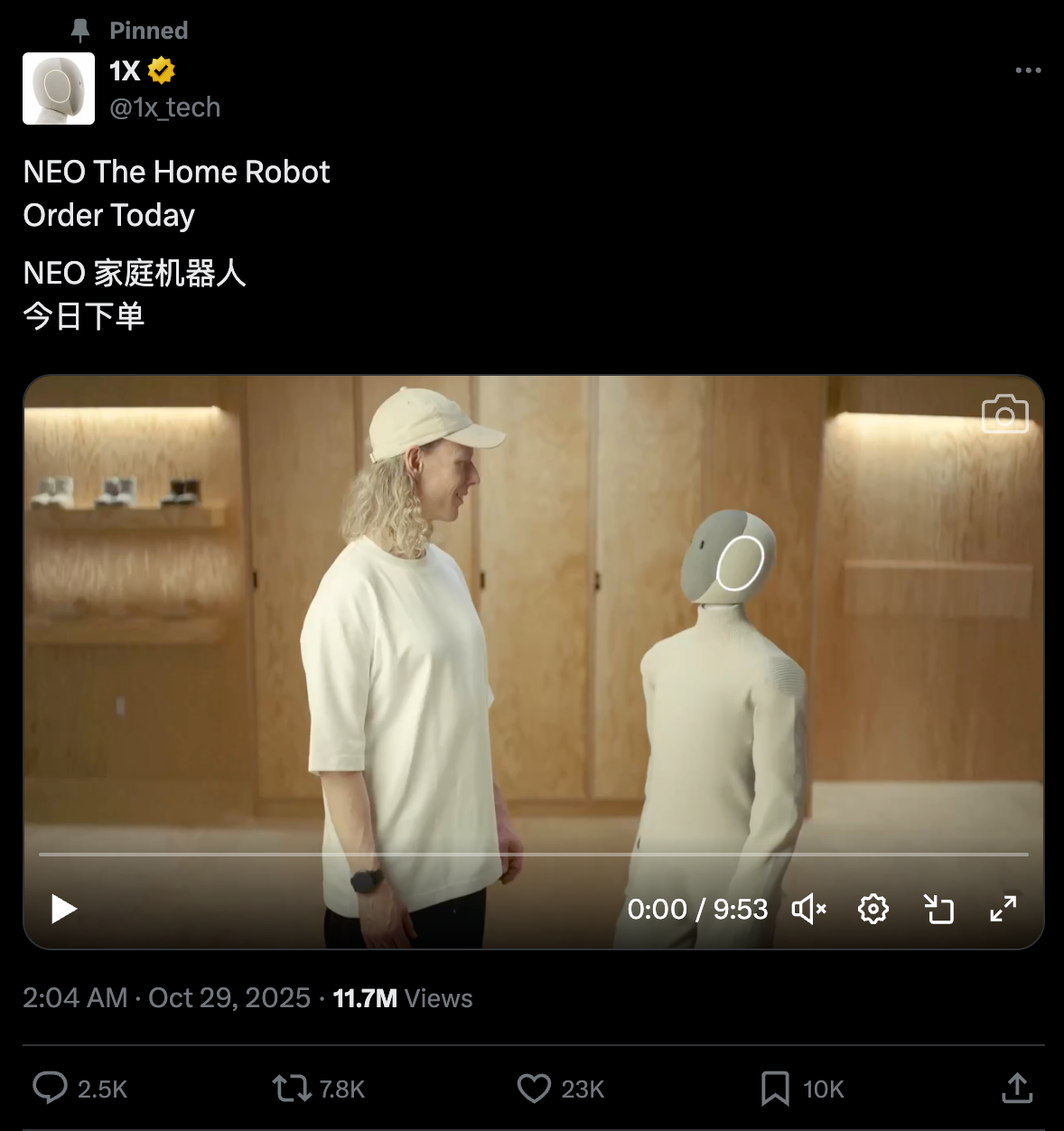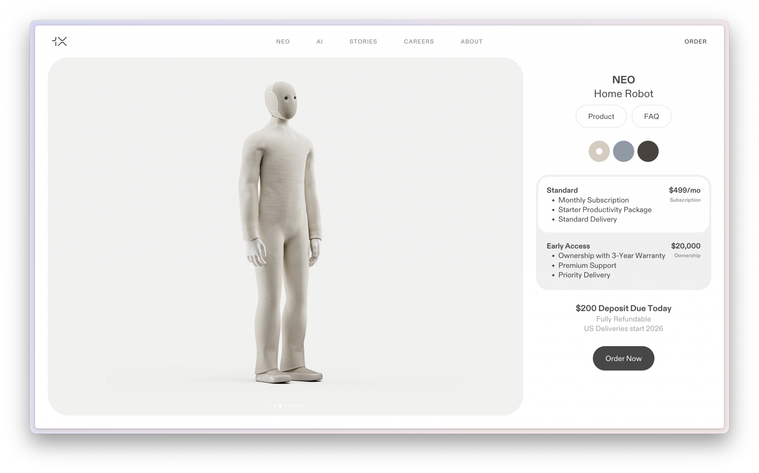 目前已经可以在 1X 官网进行预订,第一批支持美国用户,在明年开始逐一送货;预计 2027 年扩展到全球用户。