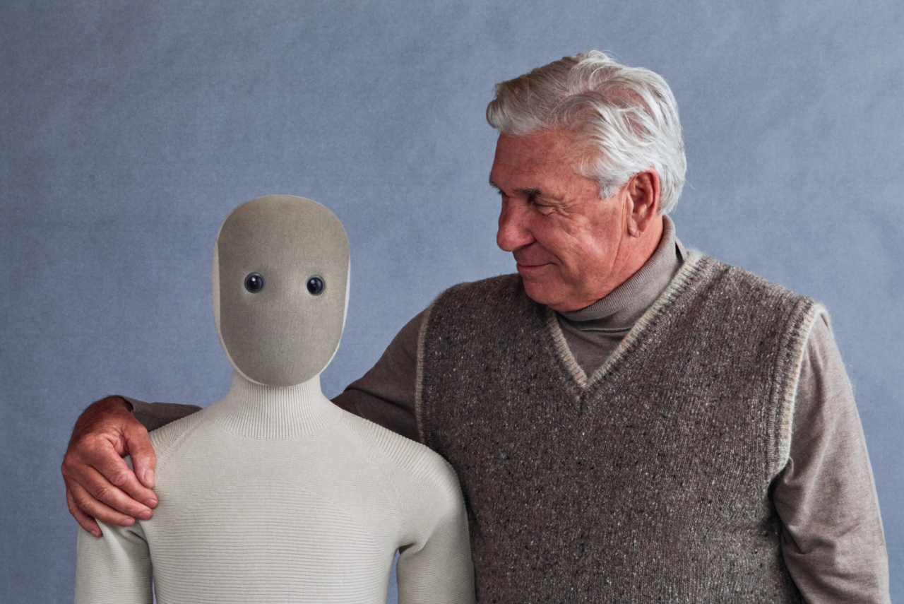 Neo 身高 1.68 米,重约 30 公斤,全身覆盖柔软聚合物外壳,穿着针织高领衫与运动鞋。