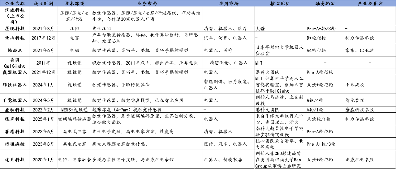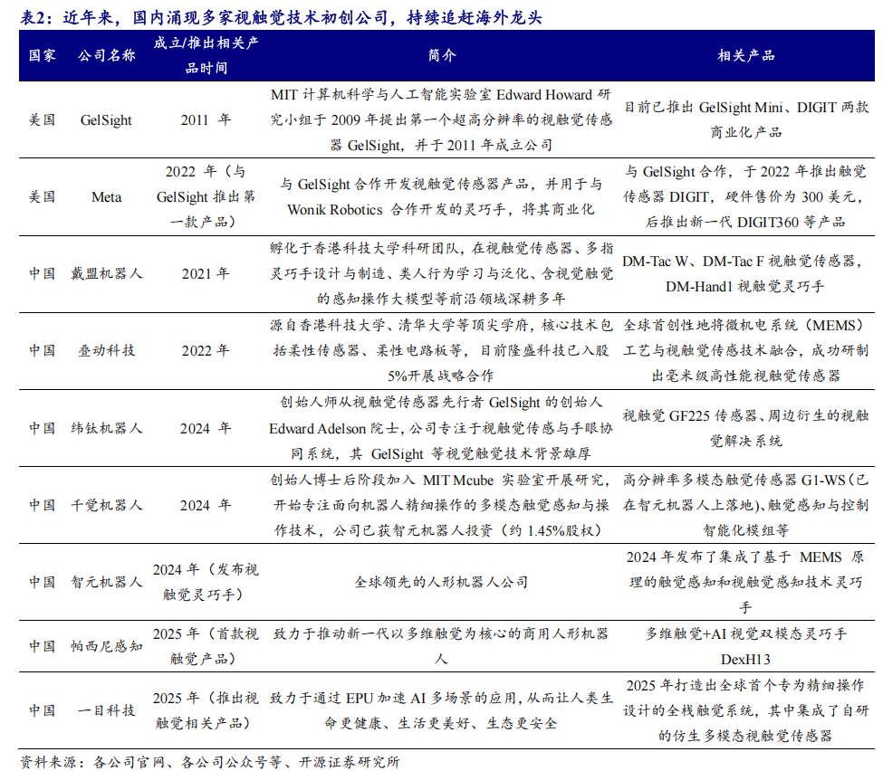 (4)、技术路线代表企业:追溯视触觉传感技术的发展,最早由东京大学研究团队在于2004年提出,2009 年经MIT CSAIL的 Edward Adelson教授团队持续迭代发扬光大。Edward Adelson教授团队此后成立Gelsight公司将VBTS产业化,目前 GelSight已成为全球视触觉传感器龙头。纬钛机器人创始人师从GelSight创立者Edward Adelson教授,延续前沿技术脉络; 戴盟机器人孵化于香港科技大学科研团队,叠动科技融合MEMS工艺与视触觉技术,千觉机器人、智元机器人、帕西尼等则通过自主研发,从多维触觉、全栈系统等方向切入新赛道。