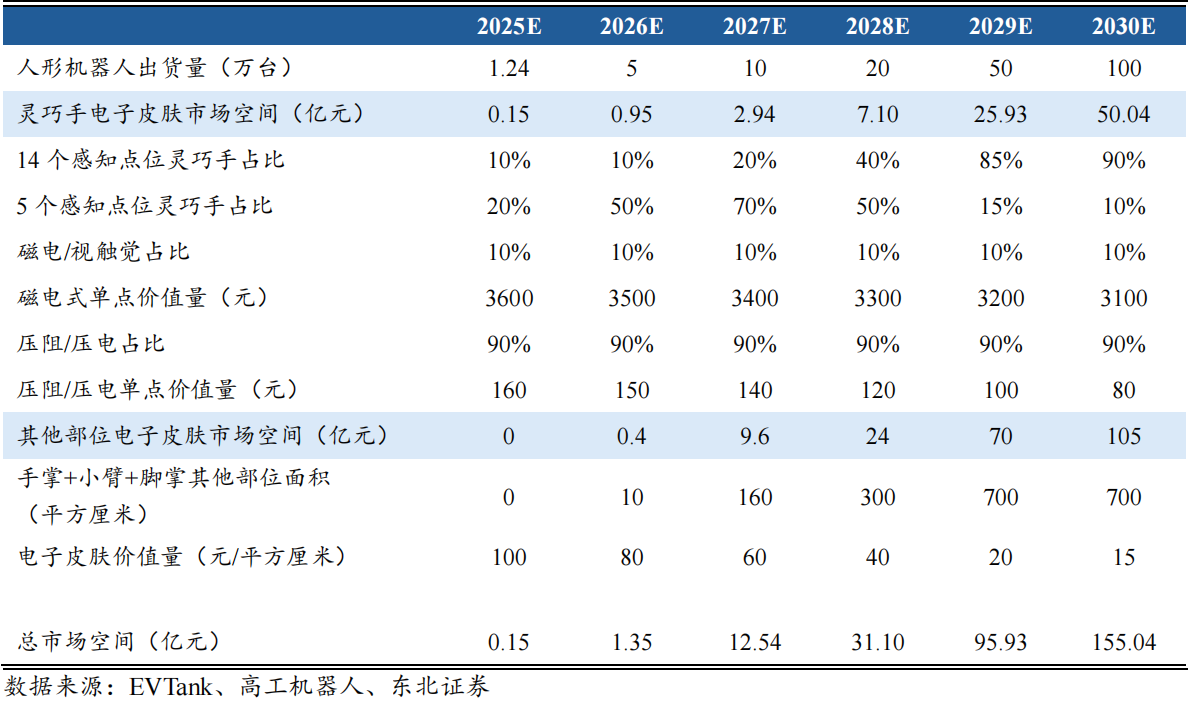 目前手臂/双腿/脚掌等其他部位电子皮肤尚未覆盖,成本下降后电子皮肤应用范围有望进一步提升,东北证券测算 2030 年人形机器人电子皮肤(包含触觉传感器)总体市场空间有望达到 155 亿元。