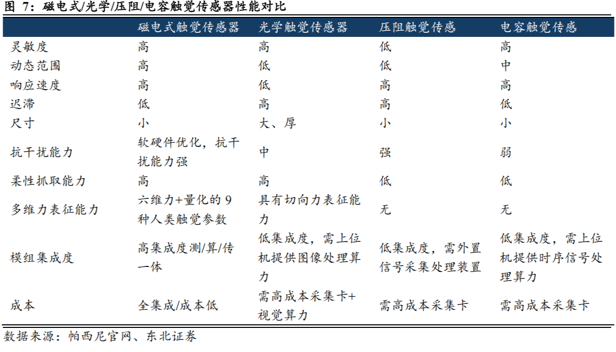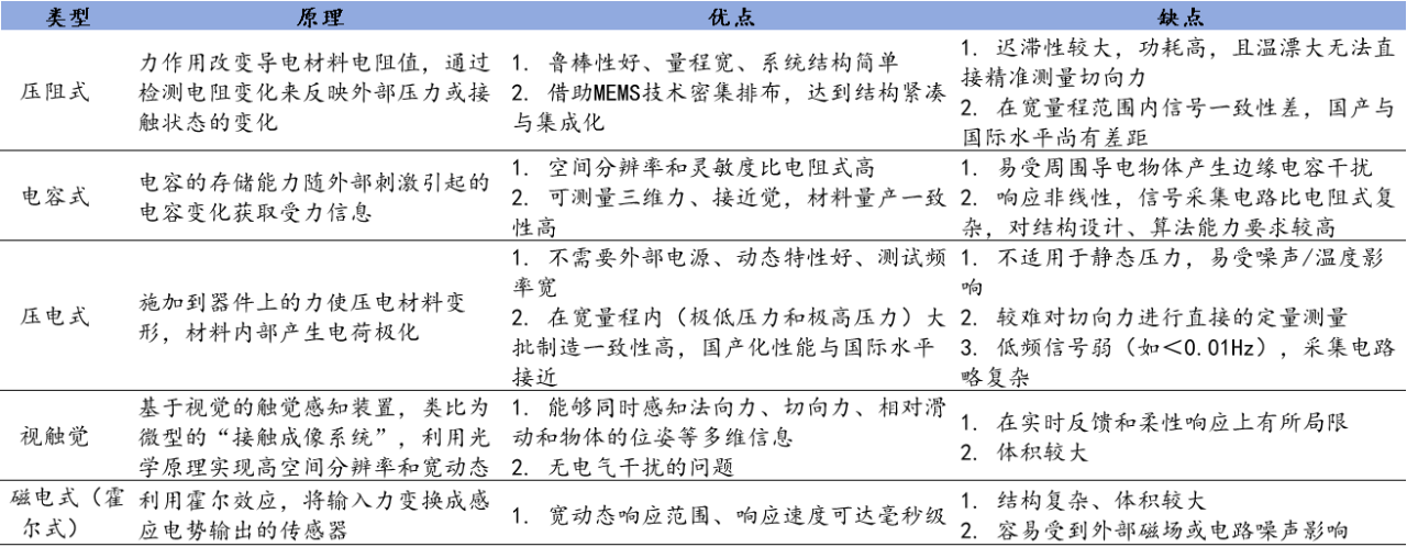 (1)压电/压阻式性价比高,技术成熟,基础的传感器模块仅可以测量法向力,若测量切向力需要复杂传感器结构采集不同坐标点数据并利用加强算法解藕,预计非精密场景人形机器人灵巧手以及大多数人形机器人手掌/小臂/双足等将首选压电/压阻/电容方案;(2)磁电&视触觉适配高精密场景。磁电式可以直接测量三维力和力矩,但是需要将磁石精准定位到晶格,生产工艺复杂,磁电式成本较高,并且无法适配强磁场环境。视触觉除了六维力之外甚至可以感知纹理/温度等其他物理信息,但算力要求高。