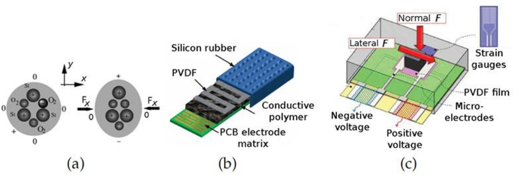 压电式触觉传感器具有很高的固定频率,适合动态测量。在外部压力作用下,压电材料产生个电荷,当外力变化时,压电材料表合动态测量面的电荷随之变化,带来输出电压信号的变化。压电效应为晶体材料在受力/压力引起的形变下产生电荷的现象。压电式触觉传感器使用的压电材料分为无机材料、有机材料和复合材料,无机压电材料一般采用锆钛酸铅(PZT)、钛酸钡(BaTiO3)、钛酸铅(PbTiO3)和铌酸锂(LiNbO3)等,有机材料采用聚偏二氟乙烯(PVDF)和聚二甲基硅氧烷(PDMS)等。