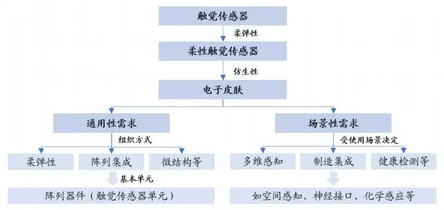 电子皮肤定义为仿生柔性传感器系统,与狭义触觉传感器相比,电子皮肤具备柔性、大面积、多类型感知特点。