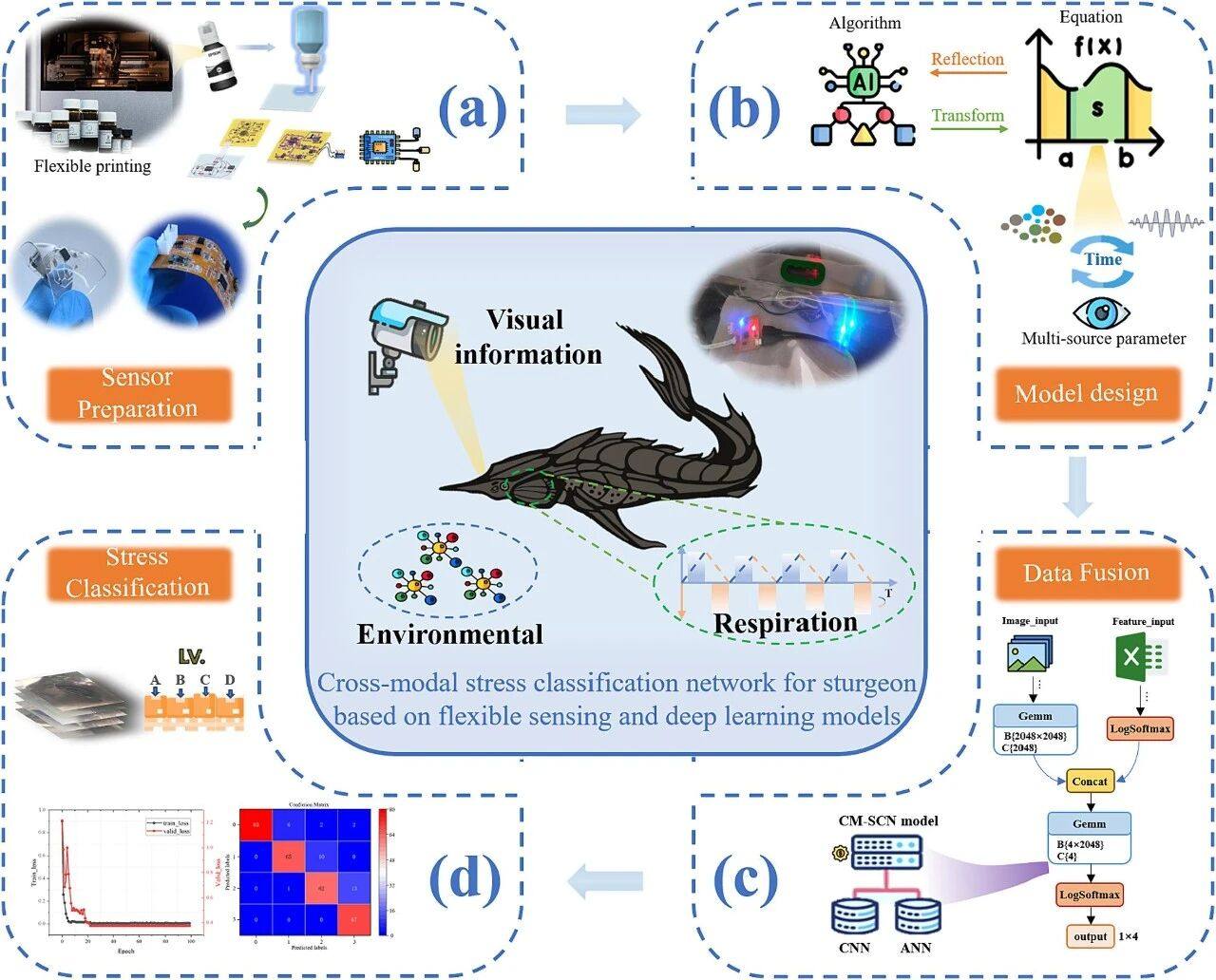 “ 鲟鱼是北方常见的经济鱼种,属于大型掠食性鱼类,生性暴躁,在运输过程中容易发生应激反应导致残伤或死亡。研判应激产生的原因,并给予相应的对策来缓解,成为养殖户和商户的重要需求。智探者与中国农业大学合作,给鲟鱼定制电子皮肤,监控鲟鱼的生理、环境和视觉特征等三个关键参数,开发多模态应激分类网络(CM-SCN),对鲟鱼应激水平进行分类,形成有效的鲟鱼健康实时监测方法。成果以“Non-destructive classification of sturgeon stress using cross-modal data fusion and multi-input deep learning models”(基于跨模态数据融合和多输入深度学习模型的鲟鱼应激水平无损分类)为题发表于《Computers and Electronics in Agriculture》(IF9.3,1区TOP)上。”