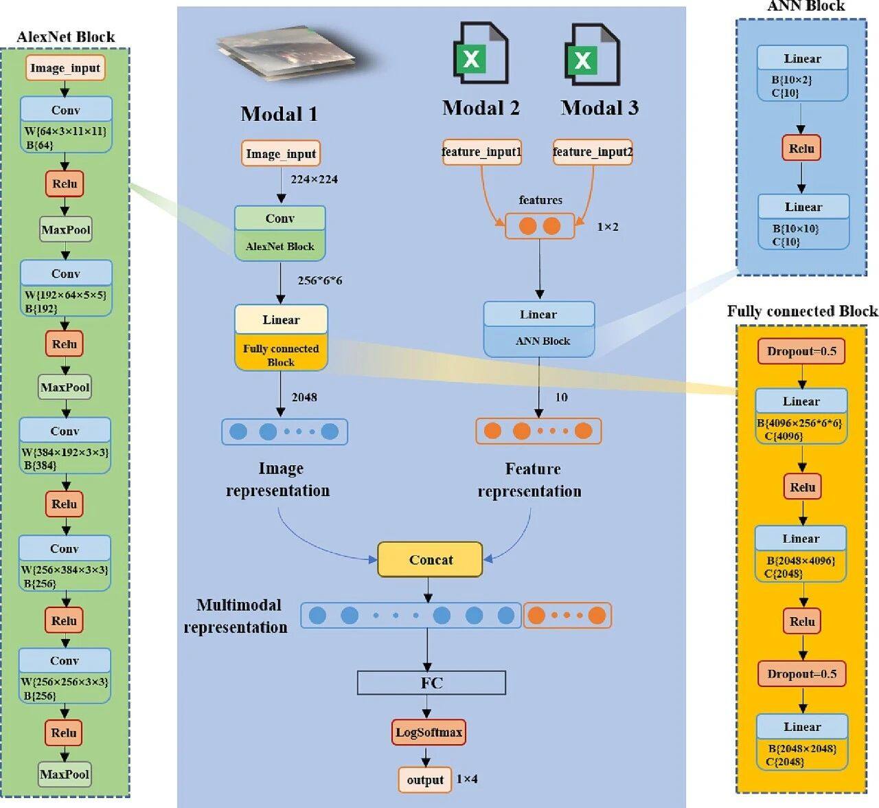 CM-SCN网络结构见图 4,三个输入模态包括鲟鱼RGB 鳃部图像、生理应力值和环境应力值,通过数据融合将鲟鱼应激水平分为四类:A、B、C、D(代表轻度、轻度、中度和重度应激水平)。