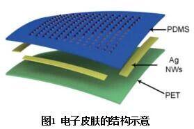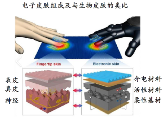 人形机器人的电子皮肤电极、介电材料、活性材料、柔性基材组成。其中,柔性基底的常用材料是聚二甲基硅氧烷(PDMS),它决定了电子皮肤弹性形变性能。