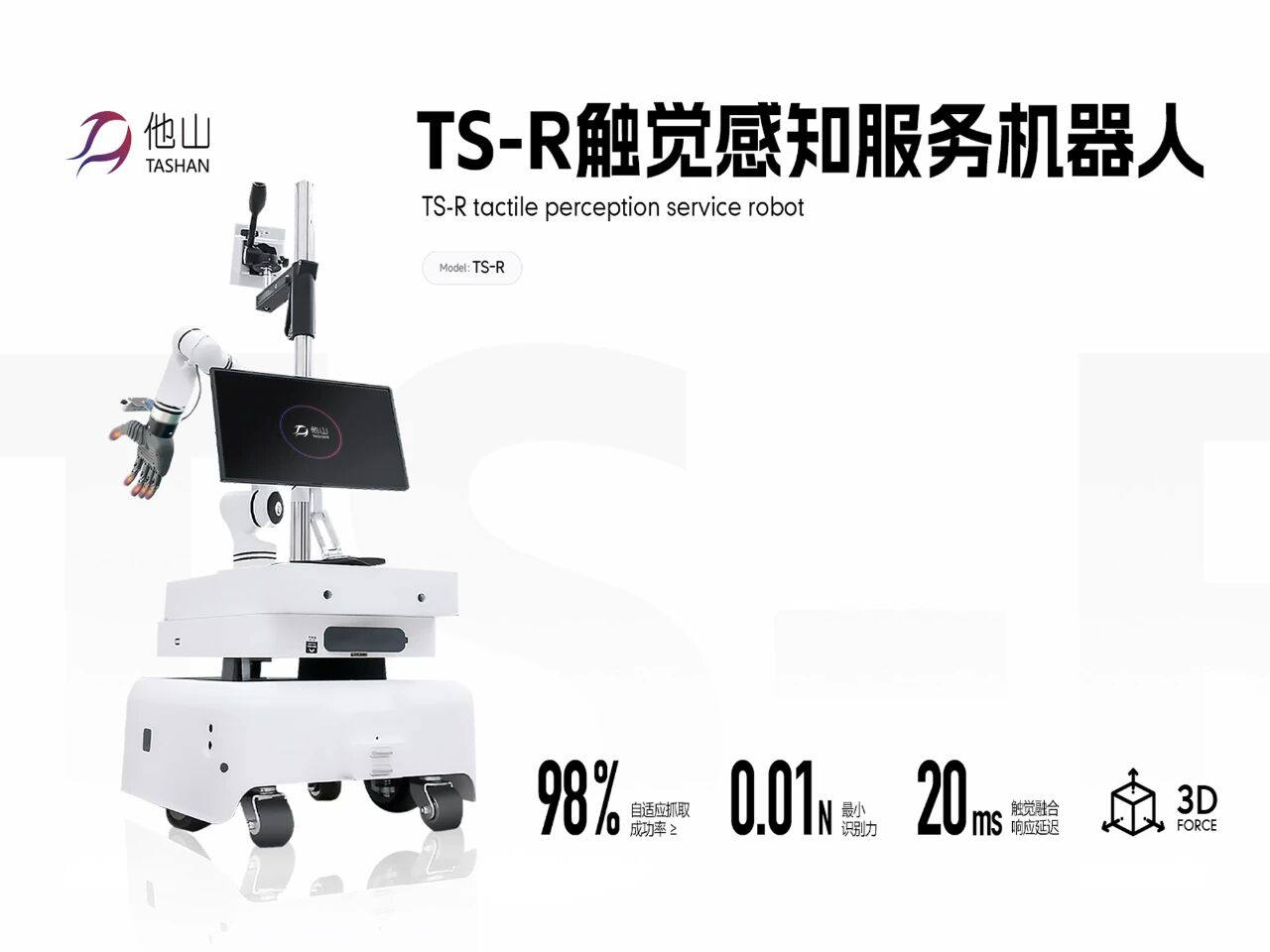该款机器人结合了他山科技触觉感知与云迹科技多态复合移动平台,能够精准感知与调节递物时的力道,实现递水、递话筒等类人服务动作,是智能触觉落地服务场景的典型示范。