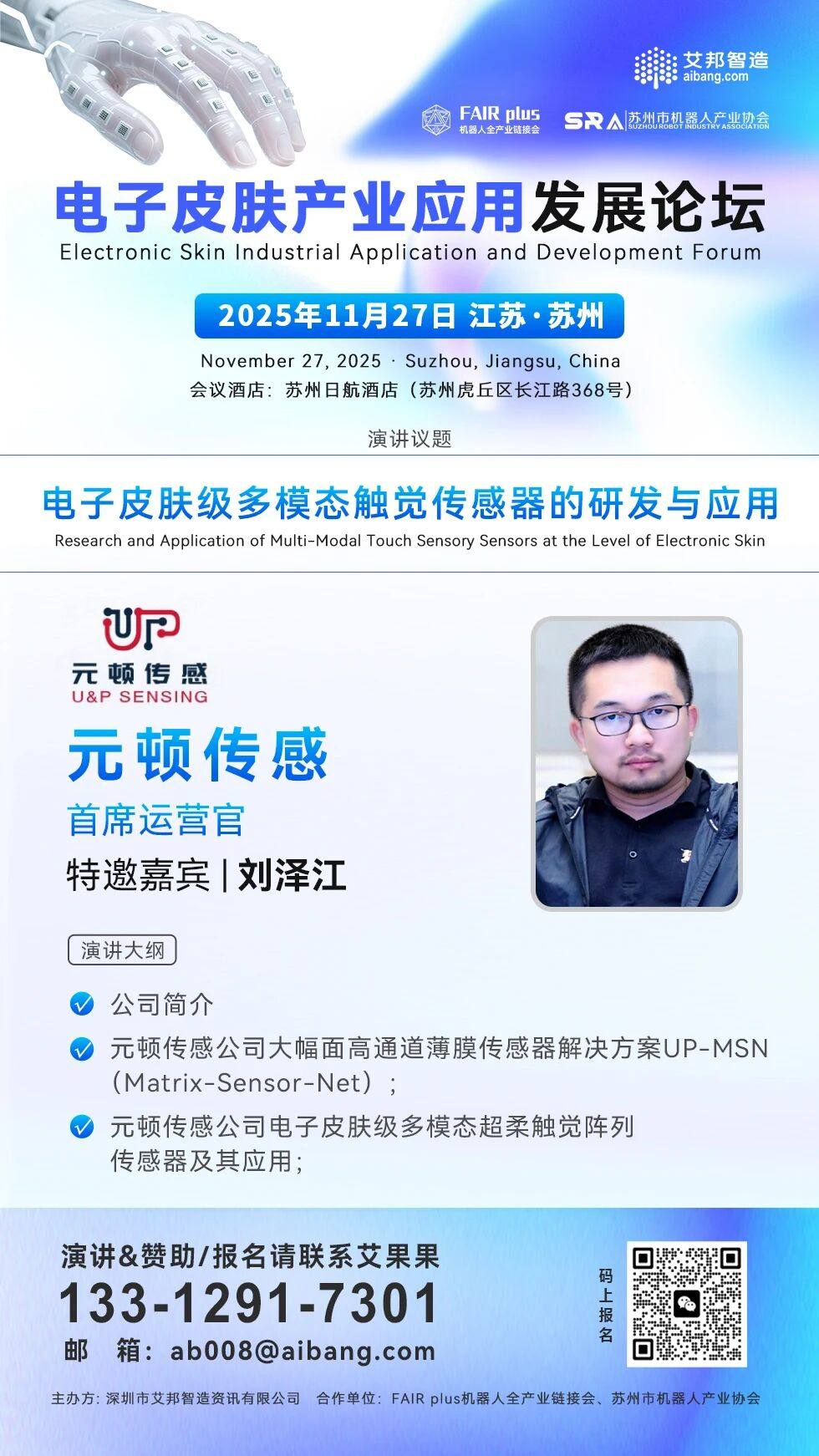 11月27日,元顿传感 CTO 刘泽江 将作为演讲嘉宾出席在苏州举办的电子皮肤产业应用发展论坛,并做《电子皮肤级多模态触觉传感器的研发与应用》的主题演讲。