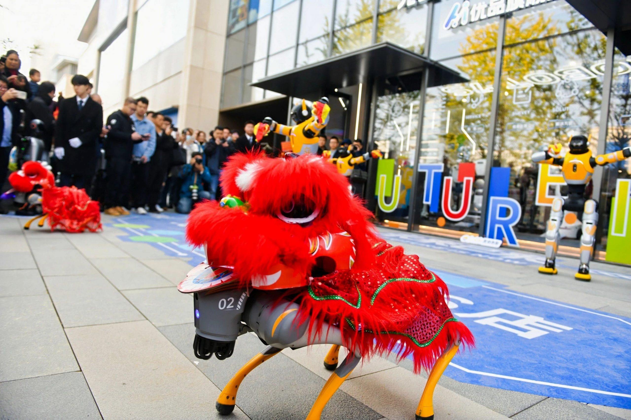 紧接着是轻盈灵动的舞蹈表演环节。三台光子S1与光子Q1-Pro机械狗携手登场,演绎别开生面的机器人舞狮秀。它们模仿传统舞狮的姿态与节奏,灵活跳跃、俯身点睛,将东方文化与现代科技完美融合,在鼓乐声中呈现一场跨越物种与时代的科技艺术盛宴。