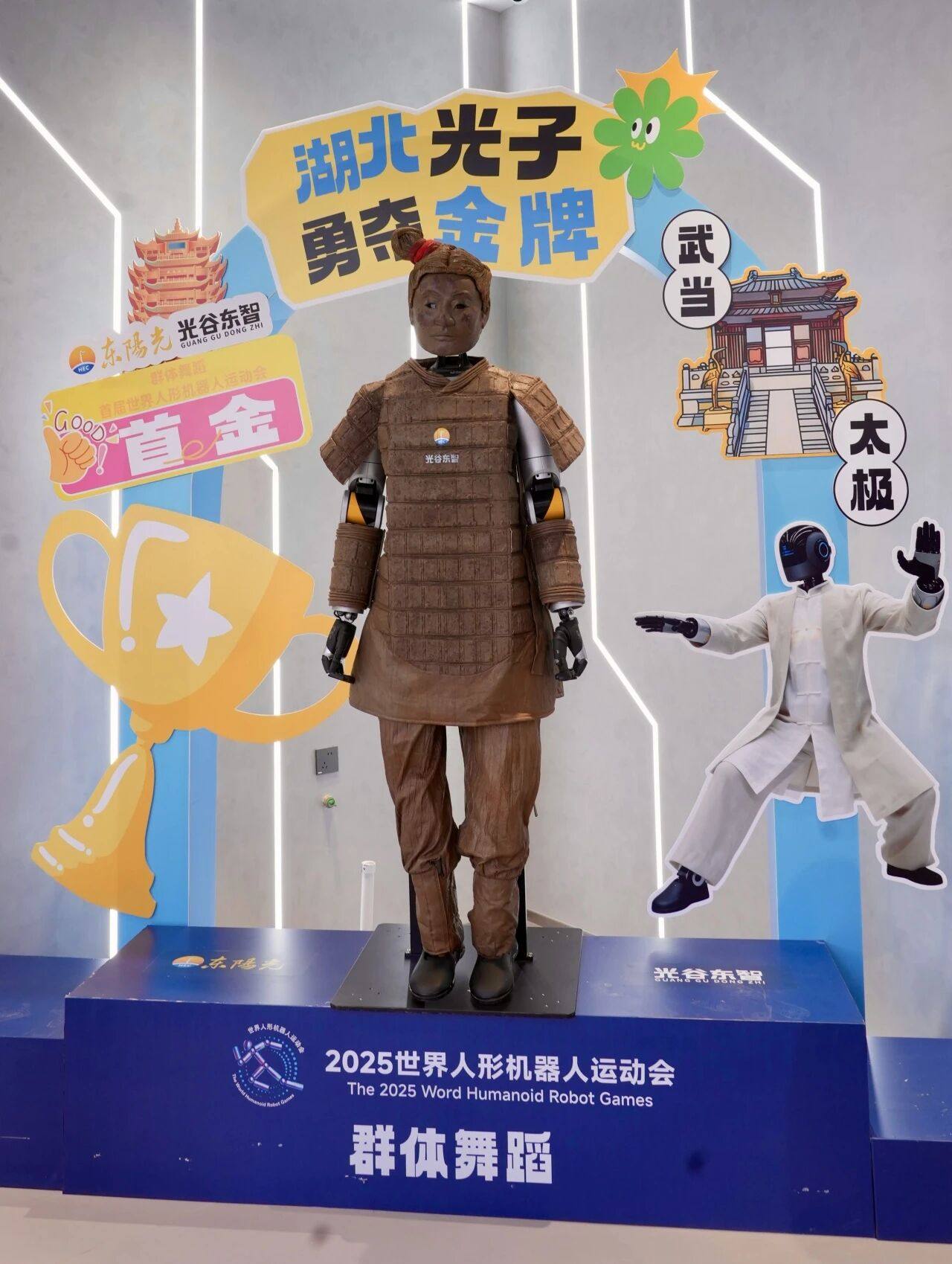 店内设有多个沉浸式互动区,其中最受瞩目的“《秦俑魂》夺冠主题打卡点”,现场重现光谷东智自主研发的光子Lumen H1在世界人形机器人运动会中夺得首枚金牌的荣耀时刻,彰显中国智造的力量。