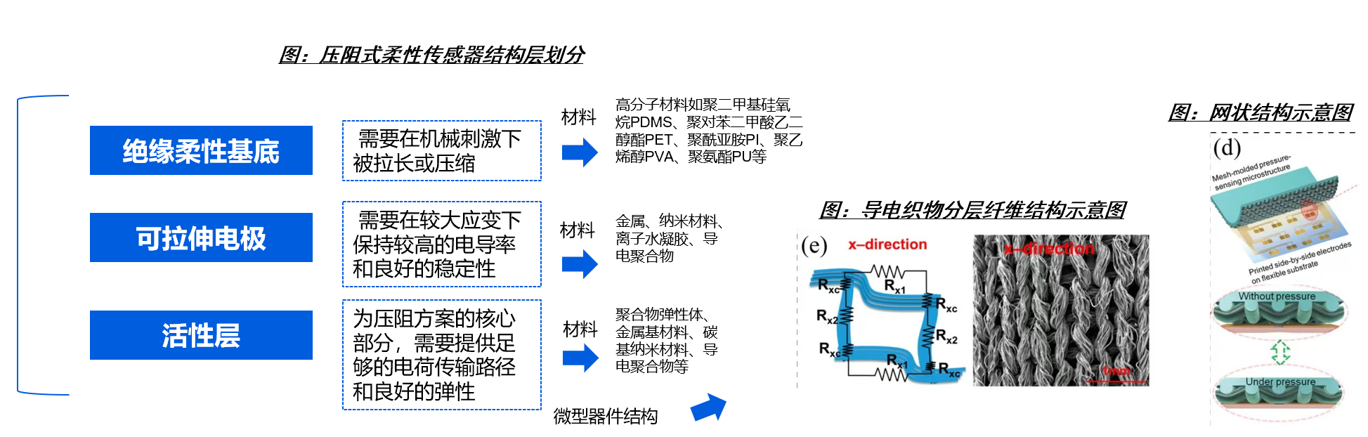 分层构成:活性层(弹性导体/半导体层)+两个电极,因此,通过调整材料种类、用量和活性层微观结构可以实现不同性能的压阻式压力传感器。