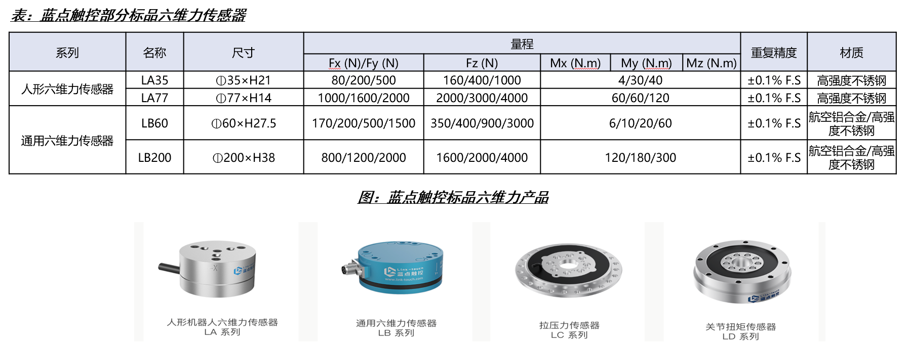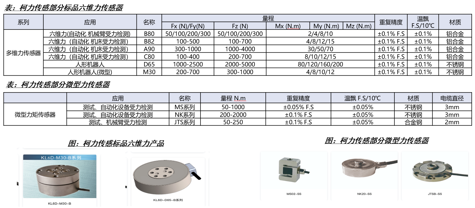 柯力传感:提供微型力矩传感器(非六维力)、六维力传感器、关节力矩传感器等产品,合作下游机器人公司包括桃子自动化、德壹机器人和开普勒,覆盖智能装备、工业机器人、理疗机器人、人形机器人等场景。