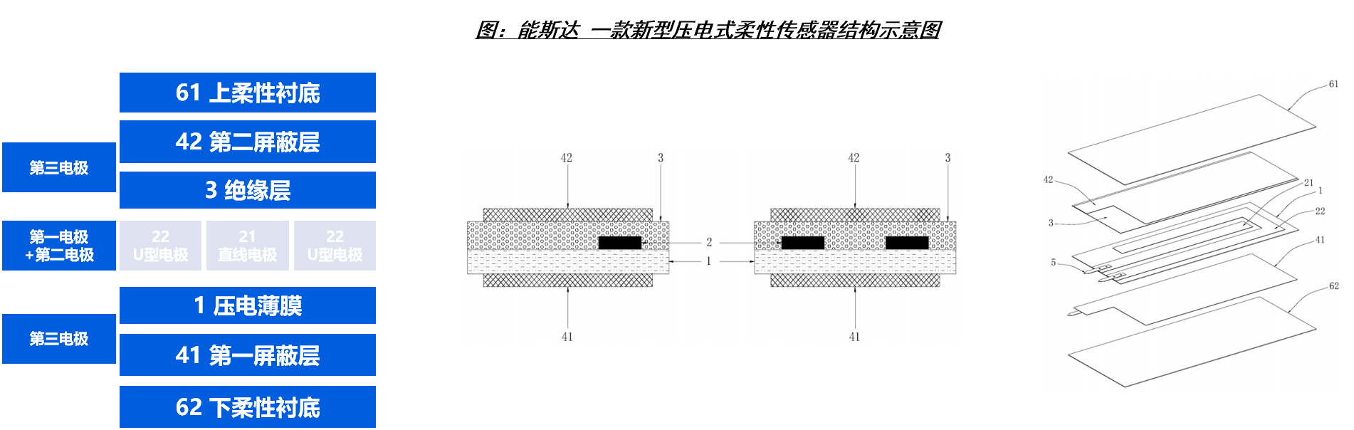 能斯达实用新型在柔性压电薄膜单面上制作电极层,优点:1)节省工艺上的时间,解决了上下两面制作电极对准困难的问题;2)有利于整个传感器结构的轻薄化;3)电极层可采用多种图案,通过增大电极材料与压电薄膜的接触面积,进一步提高传感器的感应区。
