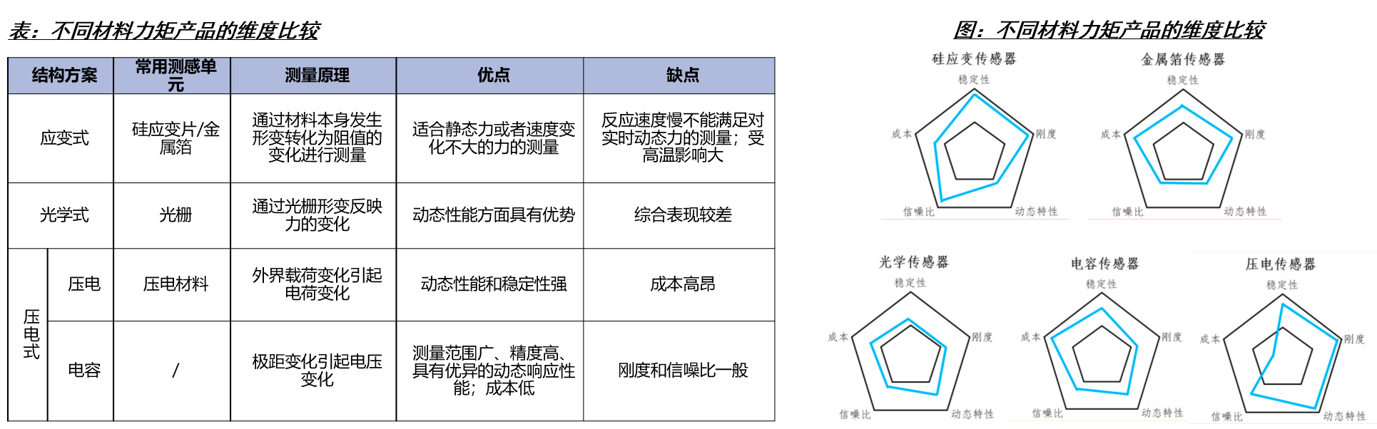 性能比较:通过对比稳定性、成本、信噪比、动态性能和刚度五个维度,硅应变和金属箔传感器相比,两者刚度类似,成本上金属箔占优,硅应变在稳定性和信噪比方面更优;电容和压电传感器相比,电容传感器成本更低;光学传感器在动态性能方面具有优势。