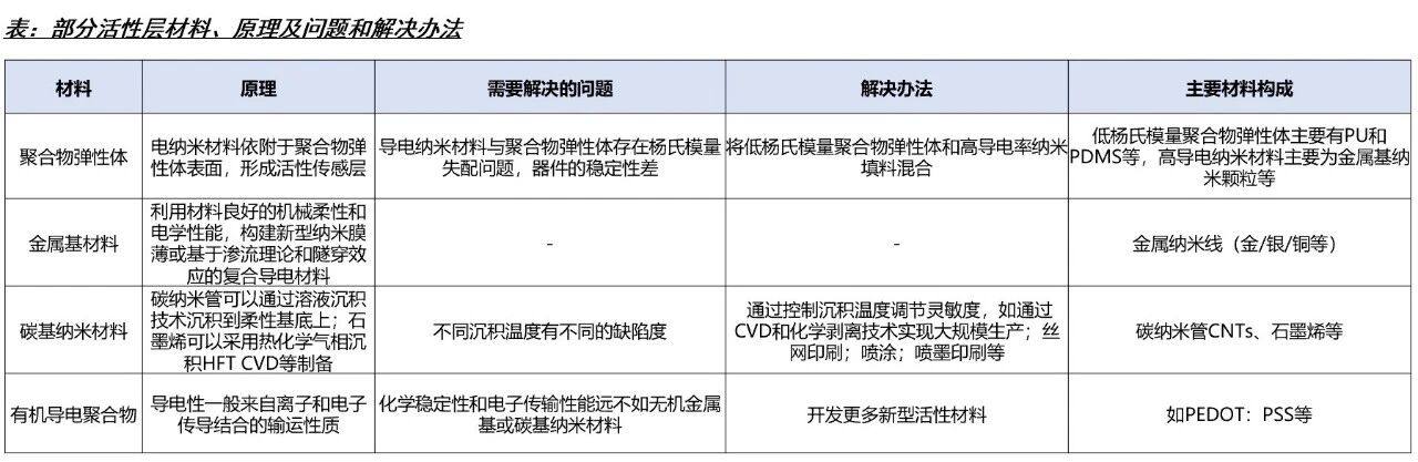 活性层材料一般指集成到绝缘弹性基底上的导电纳米材料或者由绝缘弹性基体和导电纳米填料组成的复合材料,可以包括聚合物弹性体、金属基材料、碳基纳米材料、导电聚合物等。