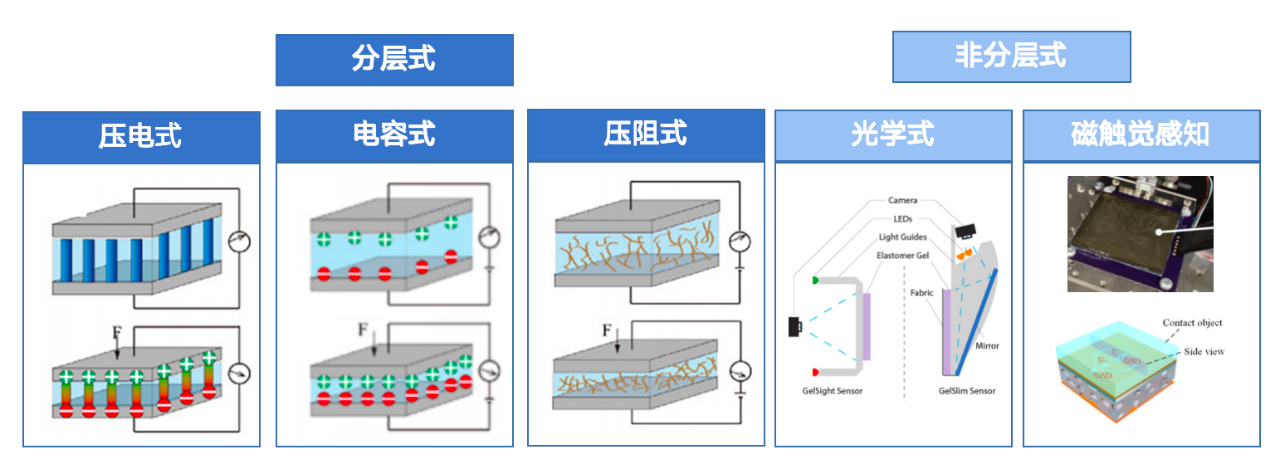 分类:基于不同的工作原理,可以将触觉传感器分为压阻式、电容式、压电式、光学式和磁触觉感知式等。