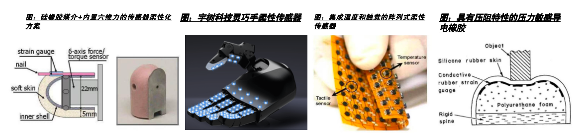 1)触觉传感器中的敏感元件单元为刚性,利用柔性材料如硅橡胶作为传播媒介,接触面不携带传感功能,仅靠刚性传感器硬件获取信息。如,将六维力传感器放置在由硅橡胶组成的柔软皮肤内部,制成灵巧手的指尖;