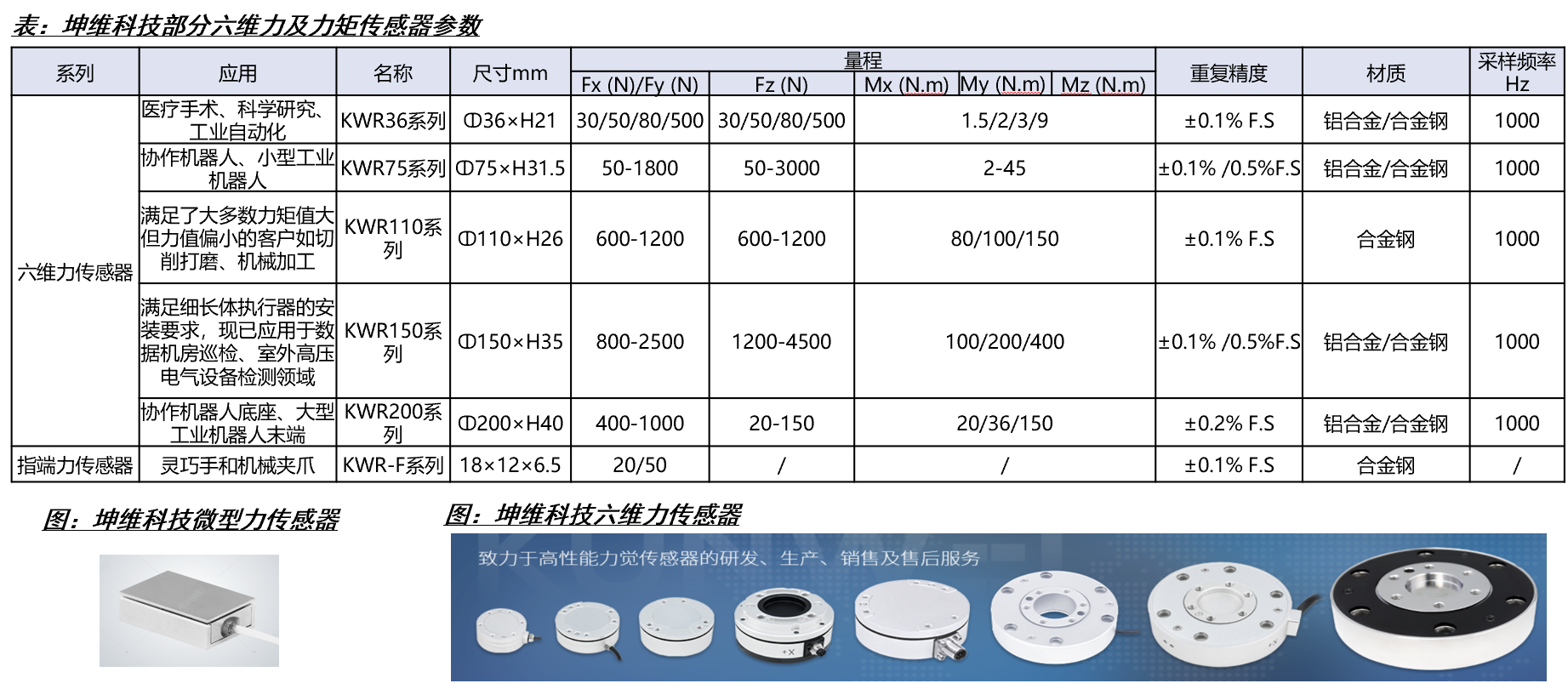 根据坤维科技公众号,公司的六维力传感器产品从30mm直径到200mm直径,量程范围涵盖20N~20KN,可基本覆盖人形机器人、协作机器人和小负载六轴工业机器人的应用场景。