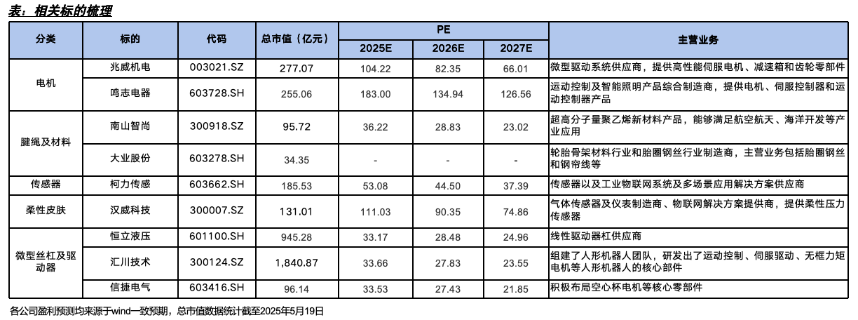 我们维持灵巧手所在的人形机器人行业“推荐”评级。我们认为人形机器人目前处于技术突破、商业化落地初期,建议关注:1)电机:兆威机电、鸣志电器等;2)腱绳及材料:南山智尚、大业股份等;3)传感器:柯力传感等;4)柔性皮肤:汉威科技等;5)微型丝杠及驱动器:恒立液压、汇川技术、信捷电气等。
