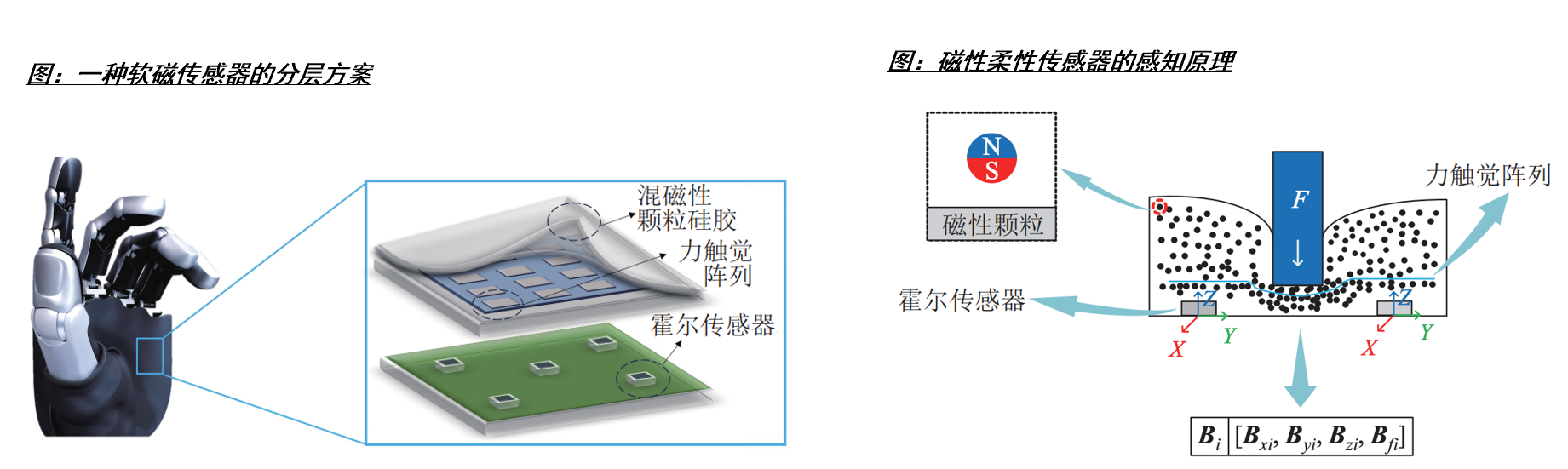 搭载霍尔传感器的磁性传电子皮肤可以解决这一问题:全表面连续感知+分层式结构,在一个感知层上实现两种异质的触觉信息的同时收集,提高集成度,减少时间和空间上的时滞差。