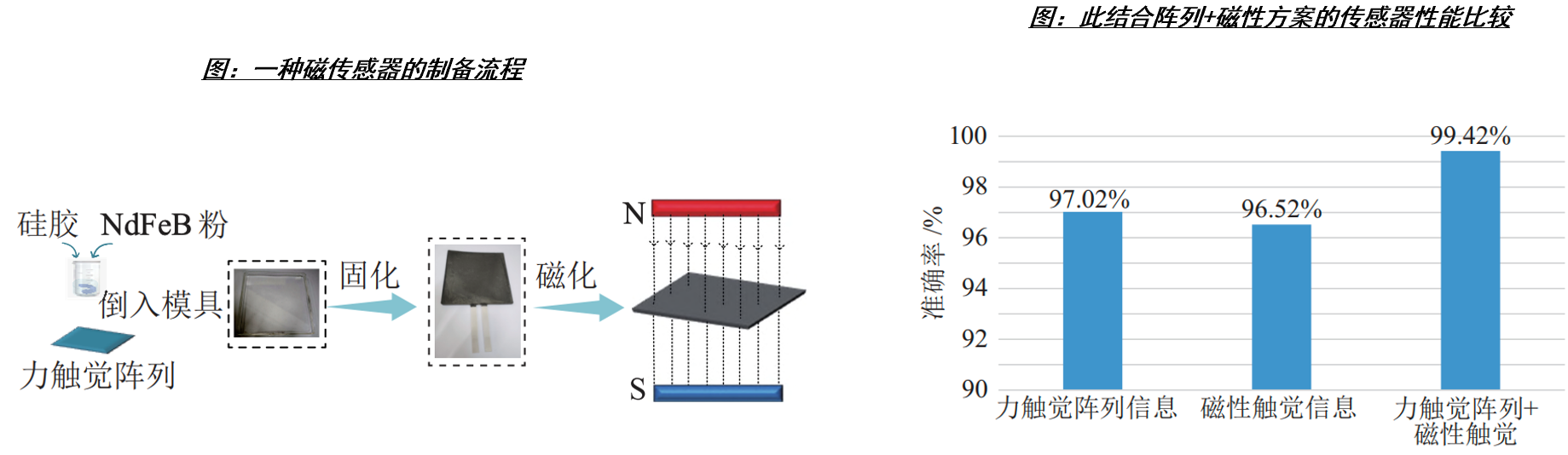 制备工艺:核心在于创新的触觉传感层的制备,如,将液态硅胶和磁性颗粒(钕铁硼磁性颗粒等)充分混合和静置,在定型模具中以一半混合物-分布式柔性触觉传感阵列-另一半混合物的顺序确定各层的位置,在室温环境下完成固化,最后放入充磁机进行定向磁化。通过这种方案,将混有钕铁硼磁粉的硅胶与分布式柔性触觉传感阵列一体成型,制备一种集成式的多模态力触觉感知层,可以在时间、空间上同步收集磁性触觉信息和力触觉阵列信息,减少磁场干扰,实现识别准确率达99.4%。