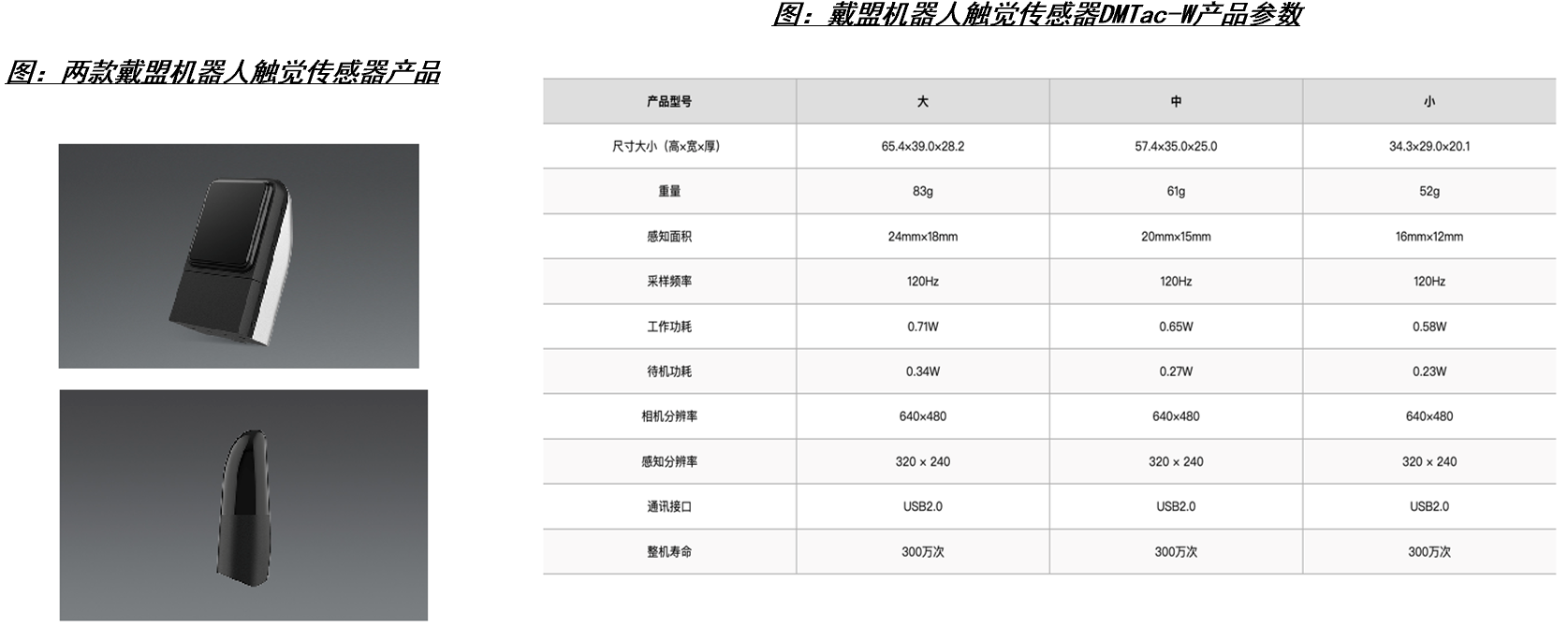 目前公司提供两款通用型的触觉传感器产品,包括适用于抓夹的DMTac-W和适配灵巧手的DMTac-F,均有大中小三种型号,感知面积分别为24mm×18mm、20mm×15mm、16mm×12mm,搭载相机分辨率为640×480。