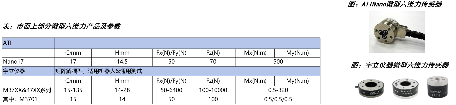 ATI公司提供多轴力/力矩传感器系统,其中,最小的六维力传感器产品nano17直径为17mm,高度14.5mm,最小测力值可达0.318克力,可以适用于机械手研究。