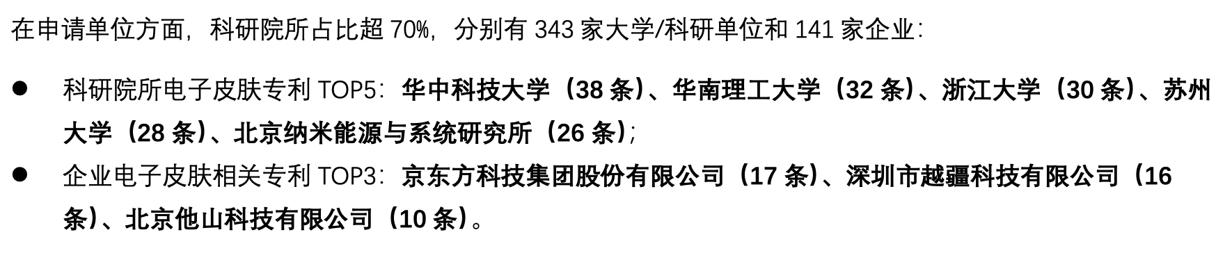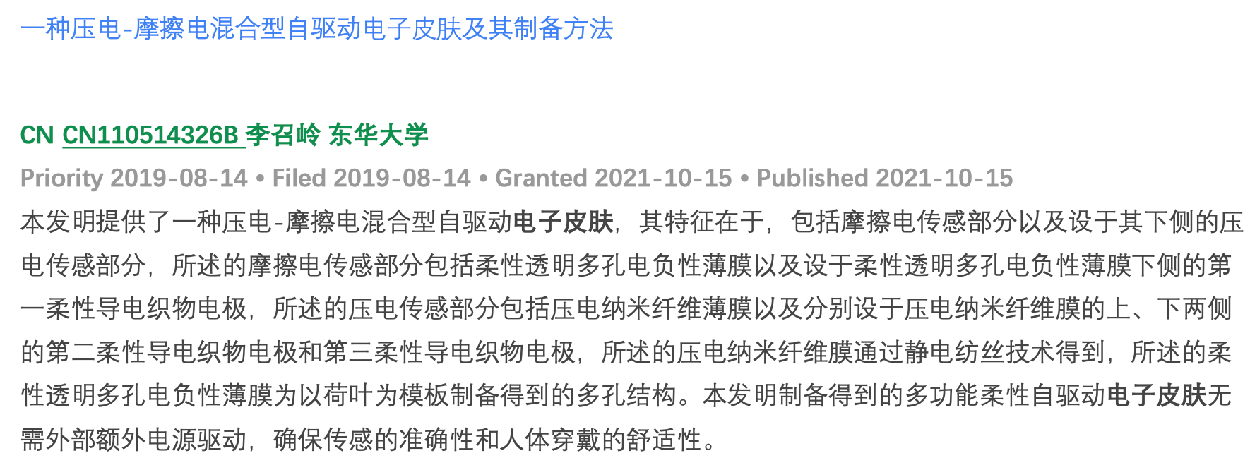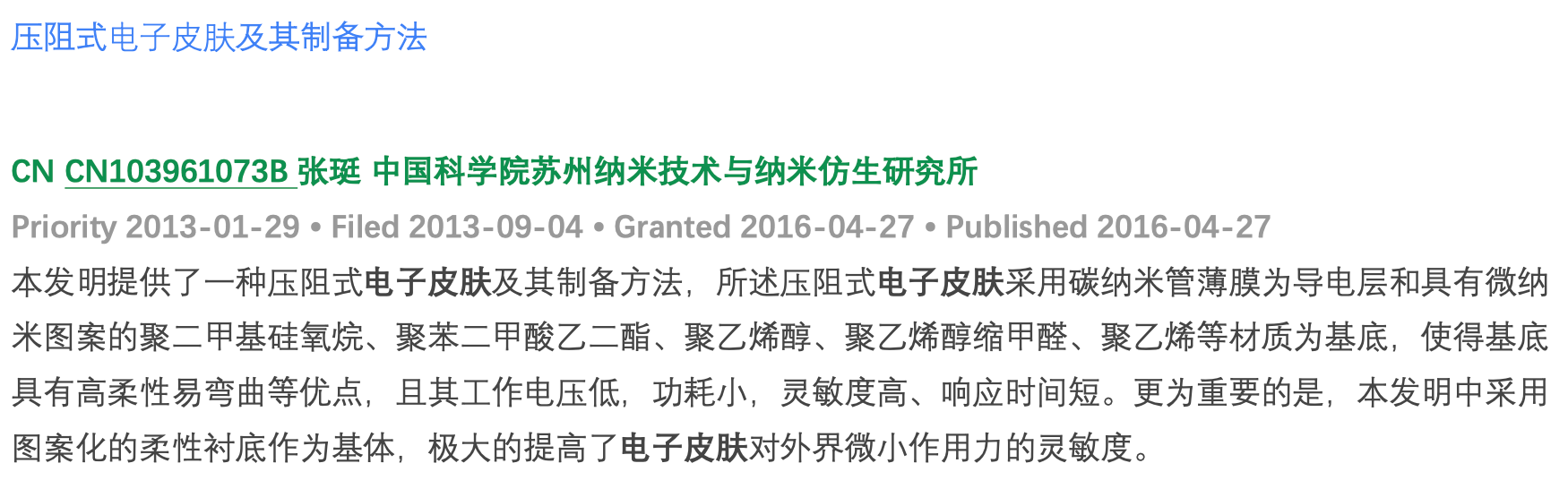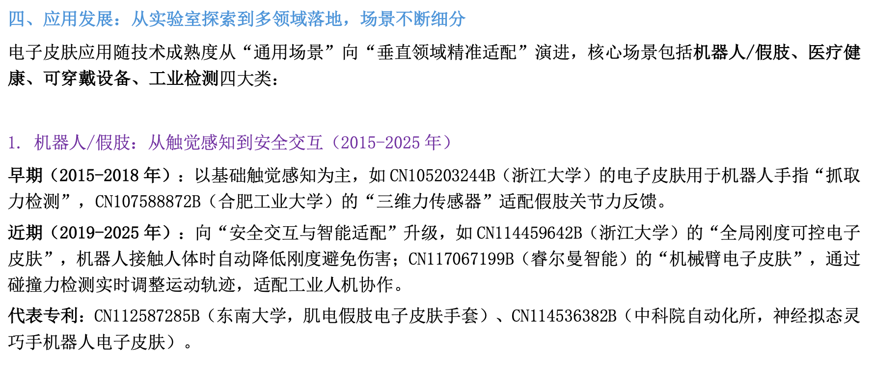 通过对“电⼦⽪肤”专利搜索结果进⾏整理发现,电⼦⽪肤专利布局从 2010 年起步,2017-2019 年进⼊爆发期,2020 年后向 “材料创新 + 场景深化 + 智能融合” 演进,整体呈现 “基础材料→传感原理→功能集成→场景落地→智能升级” 的演进路径。
