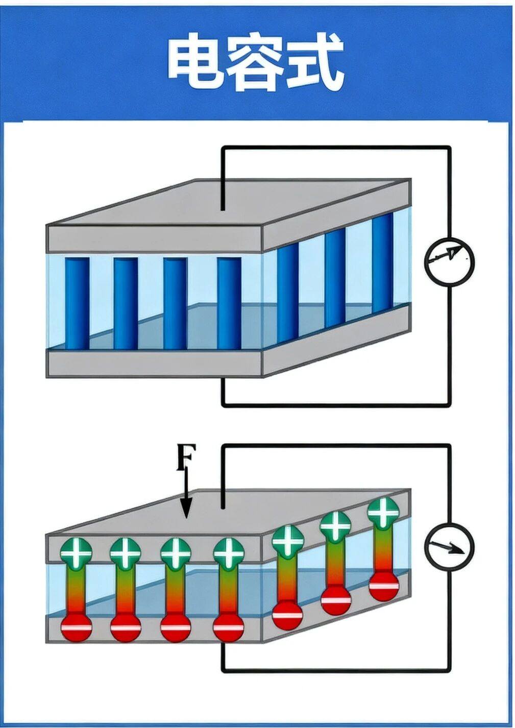 其原理为:电容通常包含上下两个电容极板和中间介电层。在外力作用下,两极板间的相对位置发生变化,从而导致电容变化,通过检测电容变化量来获取受力信息。