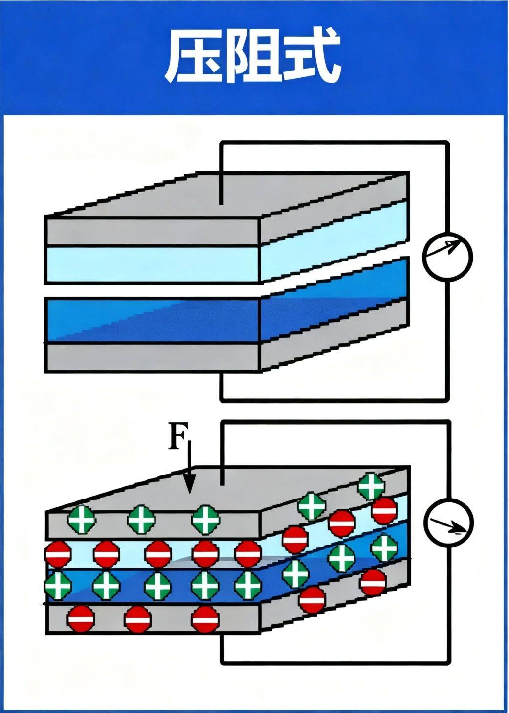 其机理为:当电极之间的压阻材料受到外界压力时,其电阻值会发生变化,通过检测电阻变化来反映出外部压力或接触状态的变化。