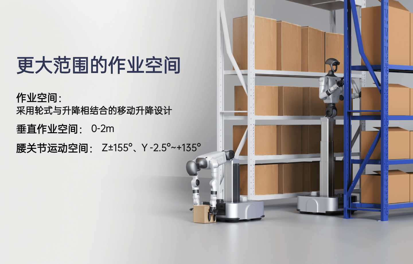 - 尺寸与作业空间:身高范围1260-1680mm,垂直作业空间覆盖0-2m;腰关节Z轴可±155°旋转、Y轴活动范围-2.5°~+135°,支持复杂作业姿态。