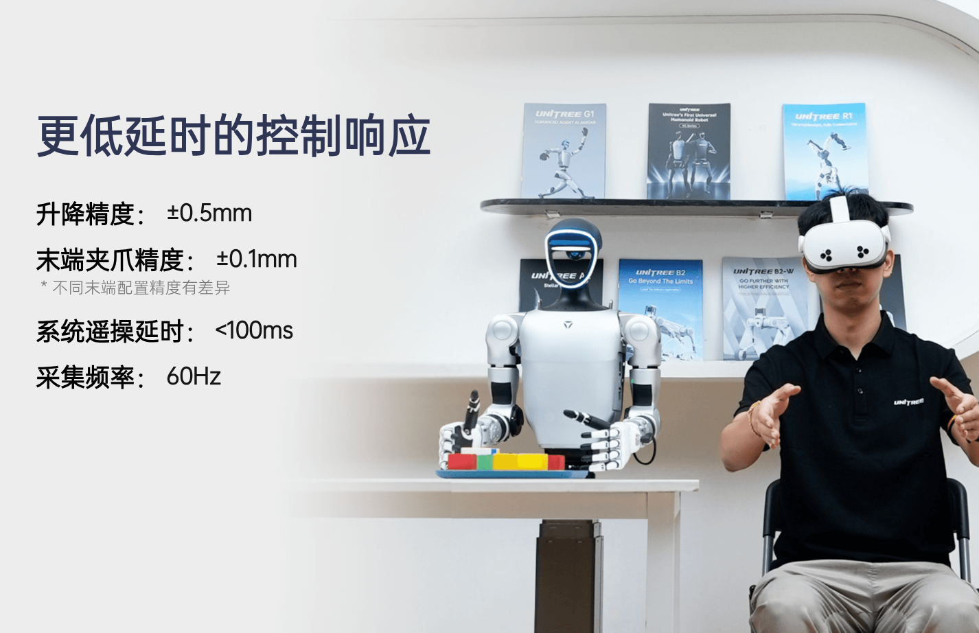 - 精度与响应:升降精度±0.5mm,末端夹爪精度±0.1mm;系统遥操延时小于100ms,采集频率60Hz,满足高精度作业需求。