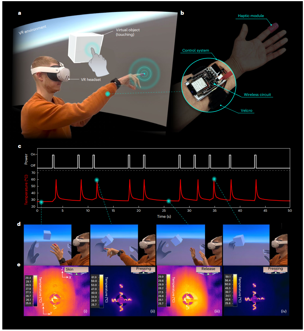 图4 | 在虚拟现实中部署手指式触觉接口。a,用户佩戴虚拟现实头盔和可穿戴接口,在虚拟环境中与虚拟物体进行交互,模拟触觉互动。b,用户前臂上无线控制系统的详细视图,展示了触觉模块、控制电路和固定的魔术贴带。c,上方:用户触摸虚拟物体时触觉接口的施加功率输入(白线)。功率输入的激活对应于提供正交力,通过形状记忆合金(SMA)驱动器产生触觉反馈。下方:SMA驱动器的温度波动(红线)随时间的激活而变化。d,用户触摸虚拟物体的动作序列。手指触觉接口提供与虚拟接触相对应的反馈。e,触觉接口在静止状态下((i),(iii);手未接触虚拟物体)和激活状态下((ii),(iv);手接触虚拟物体)的红外热成像,提供正交反馈以模拟触觉。