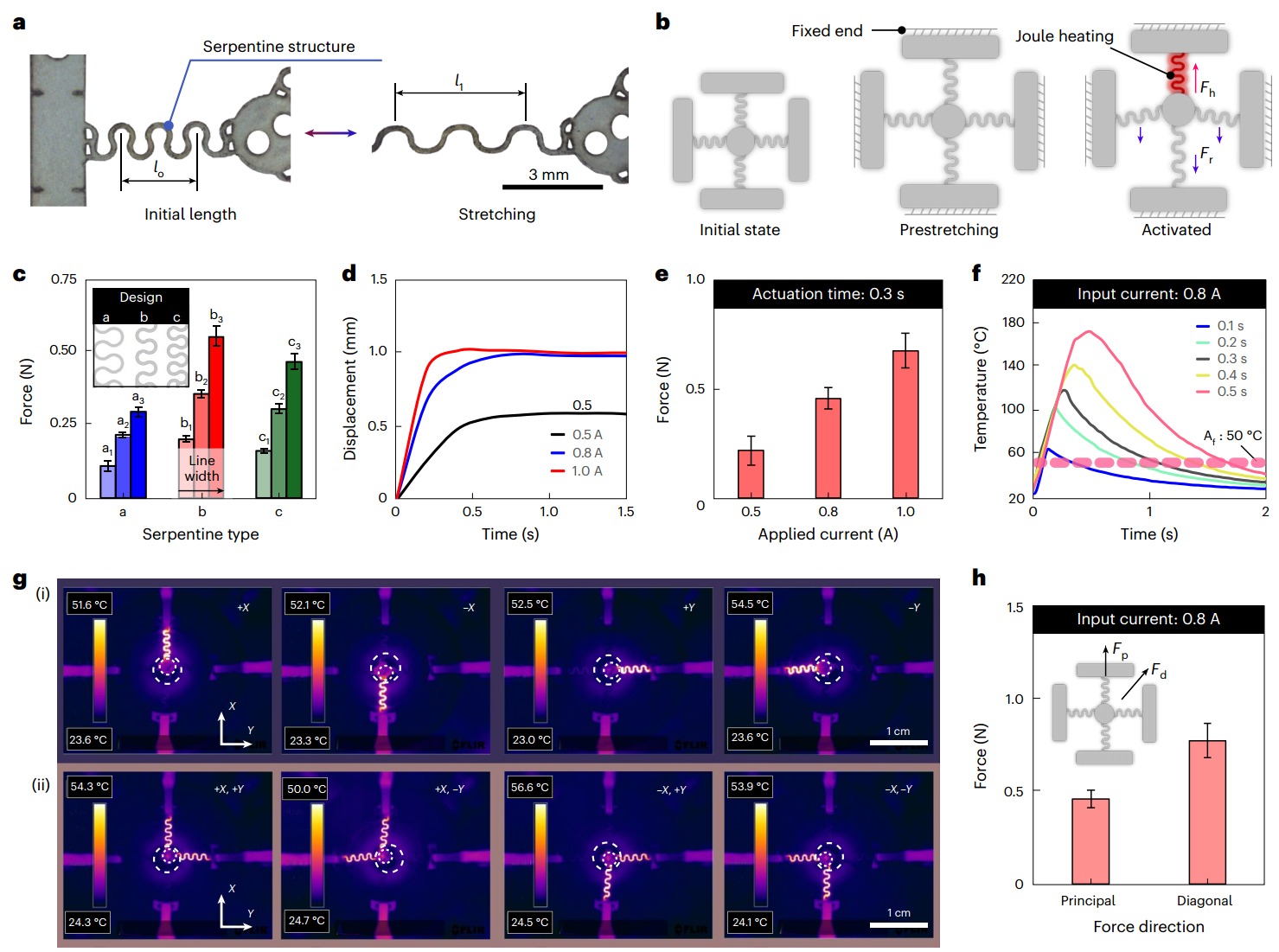 图2 | SSSA的表征。a,采用紫外激光切割机制成的SMA驱动器上的蛇形结构及其原始状态和拉伸状态。b,具有四个蛇形结构的SMA驱动器的示意图。每个蛇形结构被轻柔地拉伸至所需距离并固定。加热时,蛇形结构在驱动力Fh的作用下收缩,该驱动力与弹性恢复力Fr相平衡,从而使SMA驱动器中部的驱动结构移动。c,具有不同设计参数的各种蛇形结构设计生成的驱动器运动所产生的测量力。d,驱动结构在不同输入电流下的运动距离比较。e,SMA驱动器激活期间产生的最大力,随着施加电流强度的变化而变化。f,0.8 A电流下,驱动时间依赖的温度变化,相对于镍钛合金奥氏体结束温度Af进行测量。g,(i)切向和(ii)对角运动在平面模式下的热图像捕获。对角运动是通过在定制驱动模式下对两个相邻蛇形结构进行0.1秒的驱动实现的。h,主方向(Fp)和对角方向(Fd)产生的最大力比较。