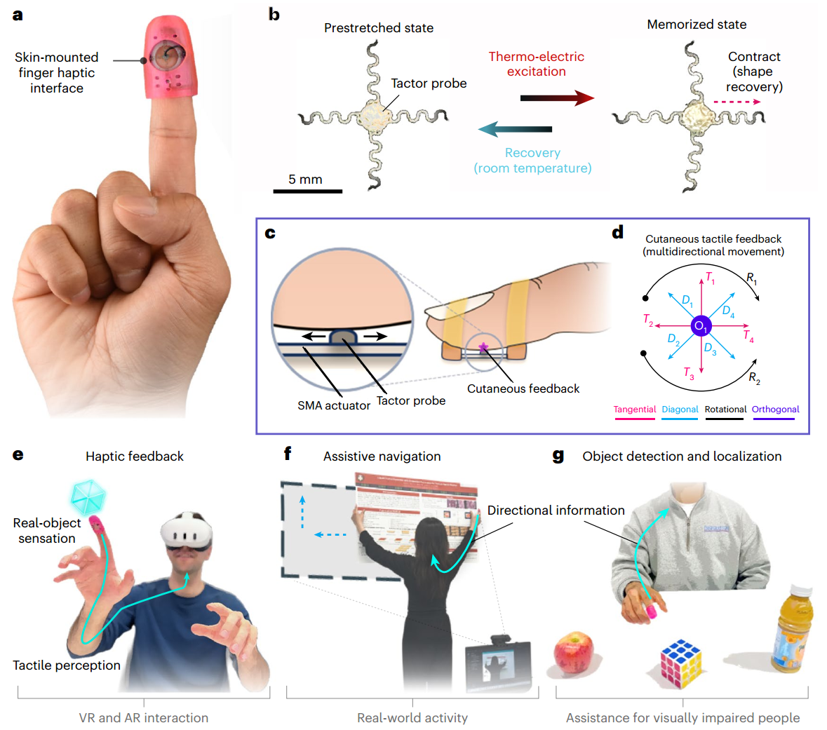 图1 | 皮肤贴附型形状记忆合金触觉接口。a,灵活的皮肤贴附型形状记忆合金触觉接口,佩戴在用户的指尖上。b,SSSA的示意图。c,SSSA的触觉器结构与指尖皮肤接触,促进皮肤触觉反馈。d,SSSA在多方向环境中根据不同驱动模式实现的多样化运动。e,通过触觉接口在虚拟现实环境中体验到的真实物体感知。f,帮助用户在现实活动中将画作挂在墙上。g,触觉接口提供的方向信息用于物体检测和定位,特别有利于视觉障碍人士。