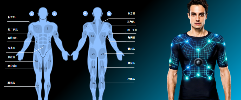在肌电传感模块,服装内置的 31个传感器构成分布式传感网络,可同步采集 27 路肌电信号及心电、呼吸等多维生理数据,实现对肌肉激活程度的连续精准监测。