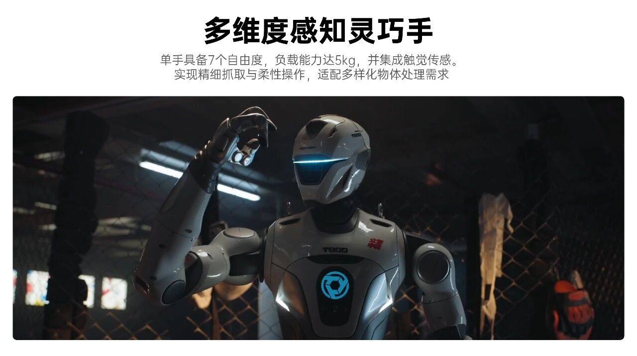 众擎T800搭载全栈自研多维度感知灵巧手,为精准操作提供核心技术支撑。其采用仿生设计,高度复刻人类手部运动轨迹,集成触觉传感系统与精准力控技术,可灵活切换重物抓取等强力型操作与精细分拣、物品递送等高精密度作业模式。