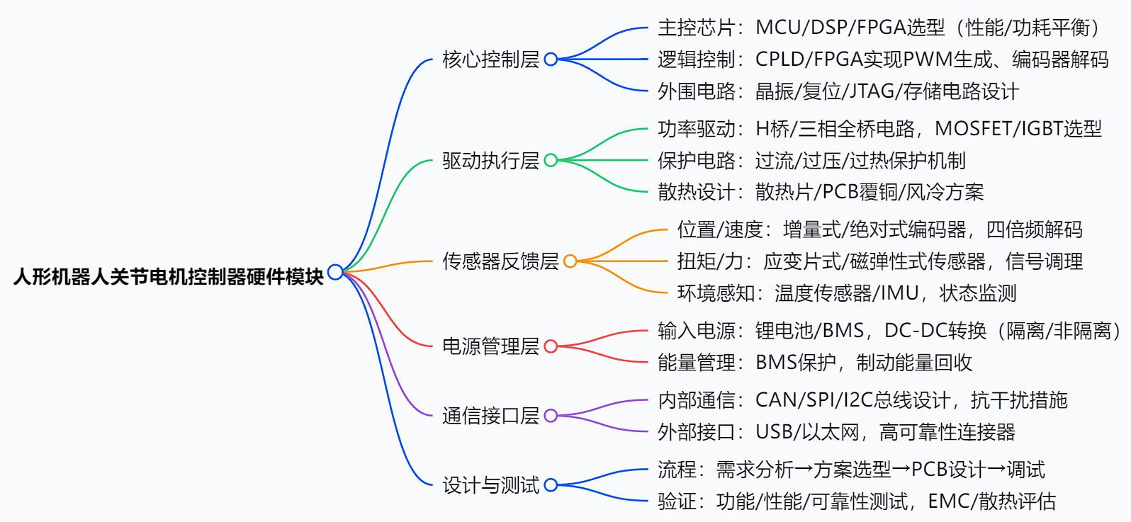 人形机器人关节模组的旋转电机控制器是实现关节高精度运动的核心硬件单元,其设计需兼顾控制精度、功率驱动能力、可靠性及模块化集成。系统架构可分为 核心控制层、驱动执行层、传感器反馈层、电源管理层、通信接口层 五大层次,各层通过硬件电路与信号链路实现协同工作。以下为分层结构思维导图: