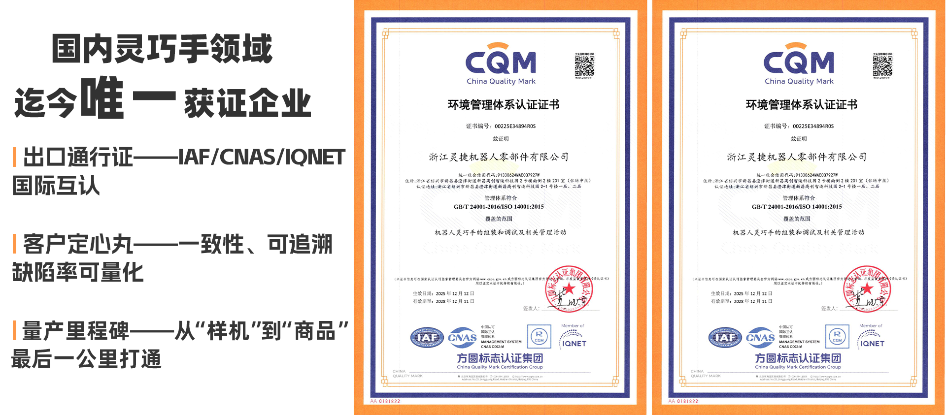 近日,灵巧智能与捷昌驱动的合资公司——浙江灵捷机器人零部件有限公司成功通过方圆标志认证集团(CQM)的严格审核,荣获质量管理体系认证(ISO 9001)与环境管理体系认证(ISO 14001)双项认证,成为国内灵巧手领域至今唯一获证企业。