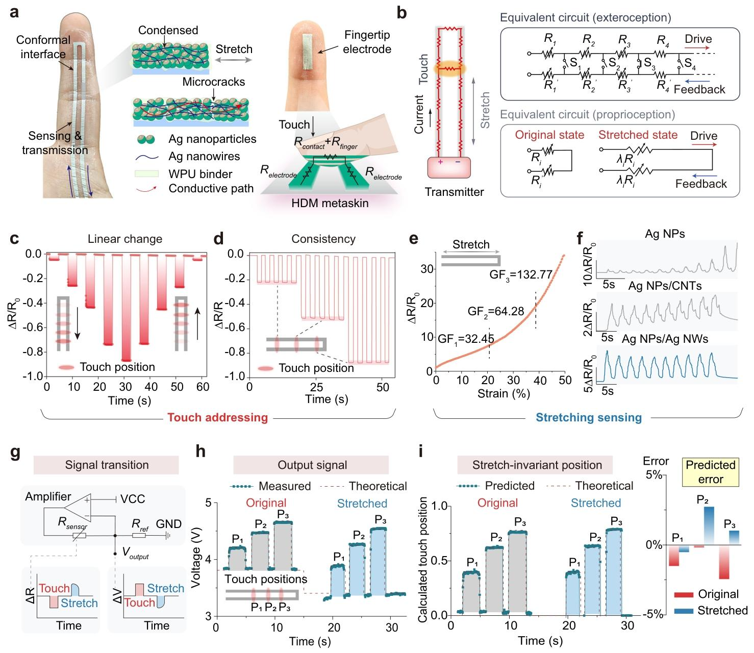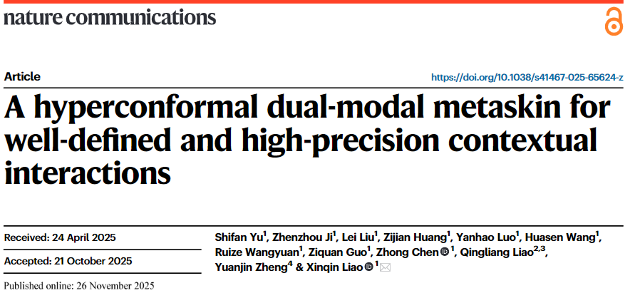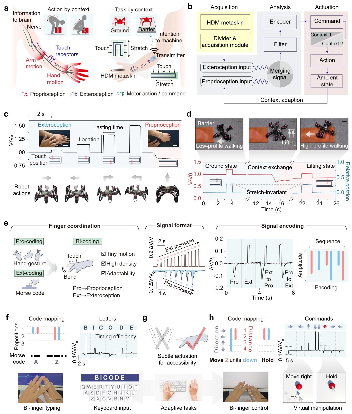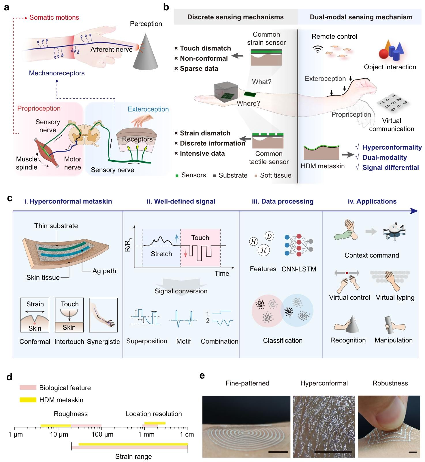 如今,厦门大学团队在《Nature Communications》发表的创新研究,推出了超适形双模态(HDM)超皮肤!它仅10微米厚,能紧密贴合皮肤褶皱,同步捕获肢体运动(本体感觉)和触觉位置(外感受觉),还能通过算法区分信号、理解交互语境,为高端人机交互带来革命性突破。