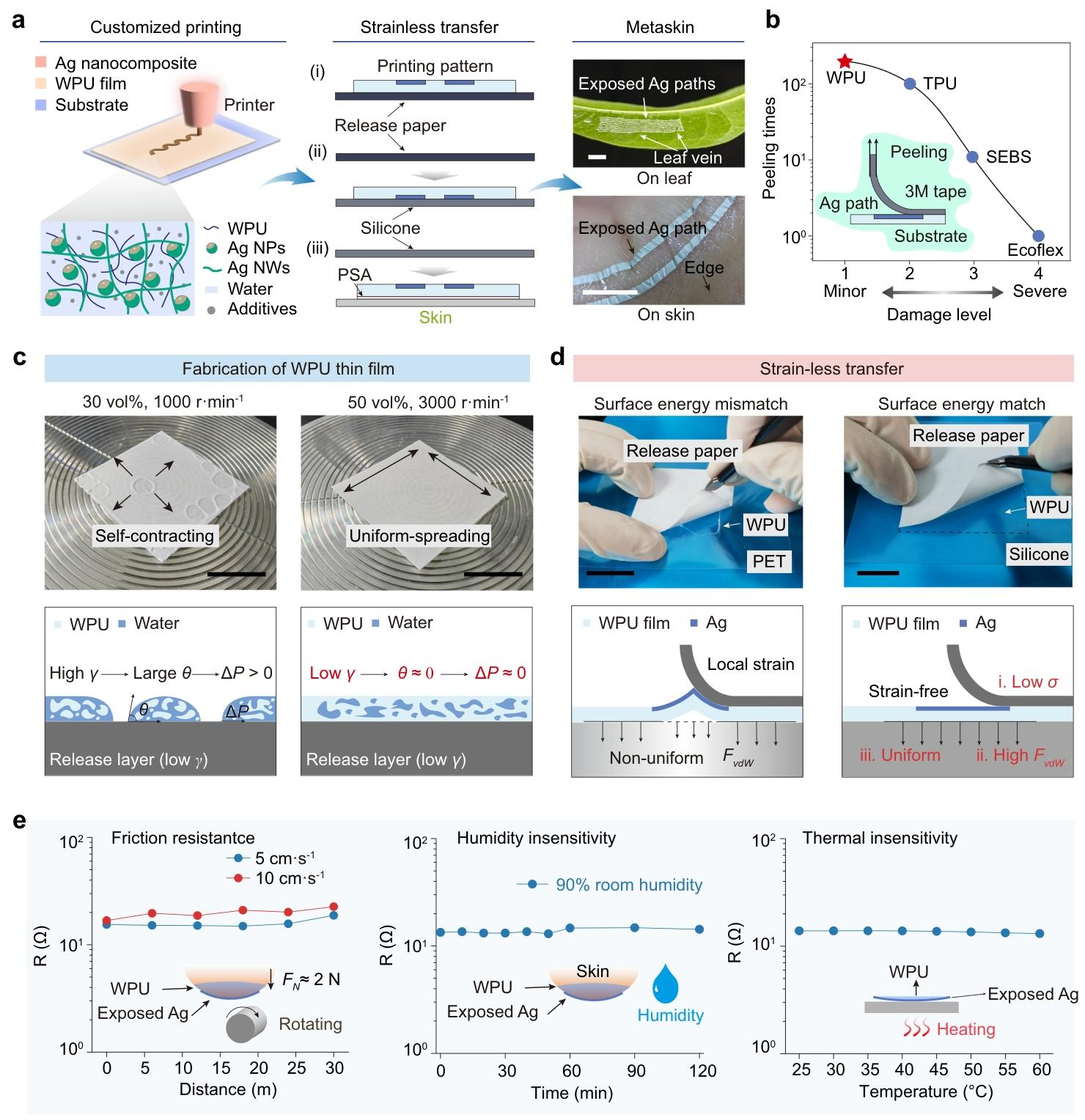 HDM 超皮肤采用 8-10 微米厚的亲水性聚氨酯(WPU)薄膜为基底,搭配两步转移策略,可无应变贴合皮肤及任意不规则表面: