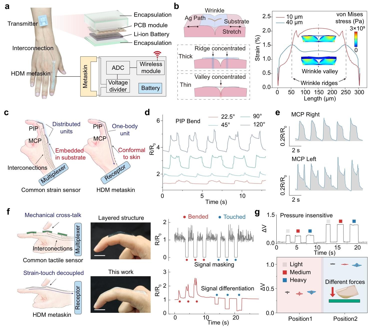 HDM 超皮肤通过 “超适形结构 + 双模态信号编码 + 智能算法” 的创新组合,彻底解决了传统电子皮肤贴合差、信号乱、结构繁的核心痛点。它不仅实现了物理层面的无缝贴合,更通过极性信号区分与语境解读,让机器能 “读懂” 人类动作意图,推动人机交互从 “被动响应” 向 “主动理解” 跨越。