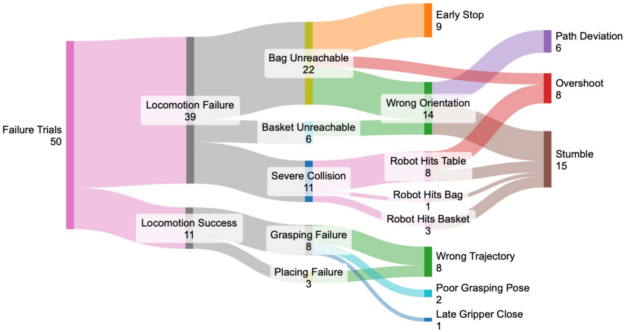执行层-控制难题:相比纯粹的locomotion,loco-manipulation对运动精准性和稳定性的要求高的多,任何偏离都可能导致目标操作物体脱离相机视野和工作空间。即使 VLA 输出了正确的运动指令,下半身控制器仍然有概率执行失败,例如出现走歪、踉跄等现象。