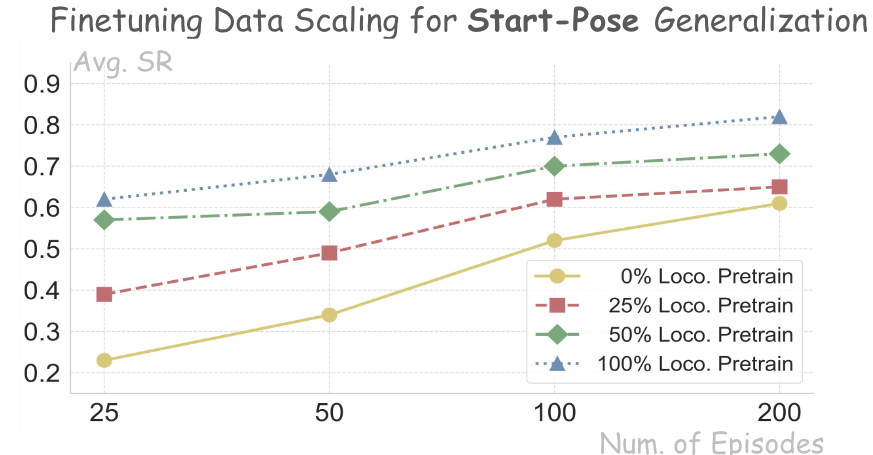 在预训练阶段,WholeBodyVLA 同时预测运动与操作两类潜在动作表示,执行统一潜在动作学习,在共享的潜在空间中对齐移动与操作的动作语义。由于这些潜在动作表示在人类视频与机器人视频之间是共享的,模型能够将从人类视频中学到的移动与操作知识有效迁移到机器人策略上。实验结果表明,随着统一潜在动作学习阶段所使用数据量的增加,模型性能持续提升,显著降低了对高成本遥操作数据的依赖。