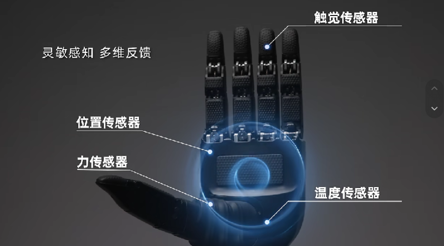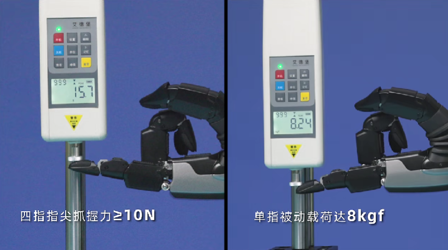 在性能方面,四指指尖抓握力 ≥10 N,单指被动载荷可达 8 kgf,整手主动抓握力≥60 N,可实现整手静态被动载荷达30KG,30+内置动作库快速调用,融合了触觉、温度传感器、位置传感器及力传感器,满足多样化应用需求。