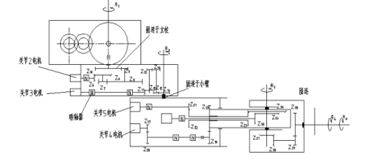 下图是整个机器人本体机械传动系统的简图。机械传动系统共有30个齿轮,为了实现在同一平面改变传递方向90°,有10个齿轮为圆锥齿轮,有利于简化系统运动方程式的结构形式。如果采用蜗轮蜗杆结构,则必然以空间交叉方式变向,就不利于简化系统运动方程式的结构形式。