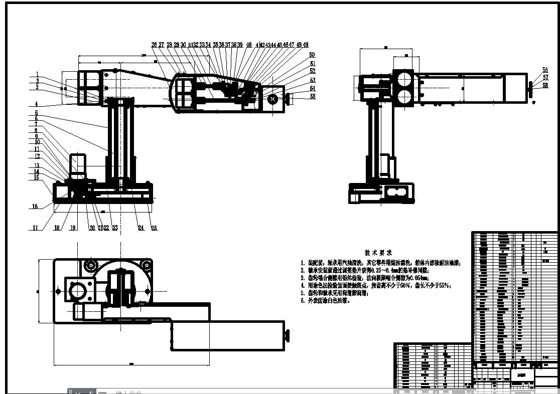 大臂上装有关节2,3的驱动电机,内部装有对应的传动齿轮组。关节2,3都采用了三级齿轮减速,其中第一级采用锥齿轮,以改变传动方向90°。第二、三级均采用圆柱直齿轮进行减速。关节2传动的最末一个大齿轮固定在立柱上;关节3传动的最末一个大齿轮固定在小臂上。